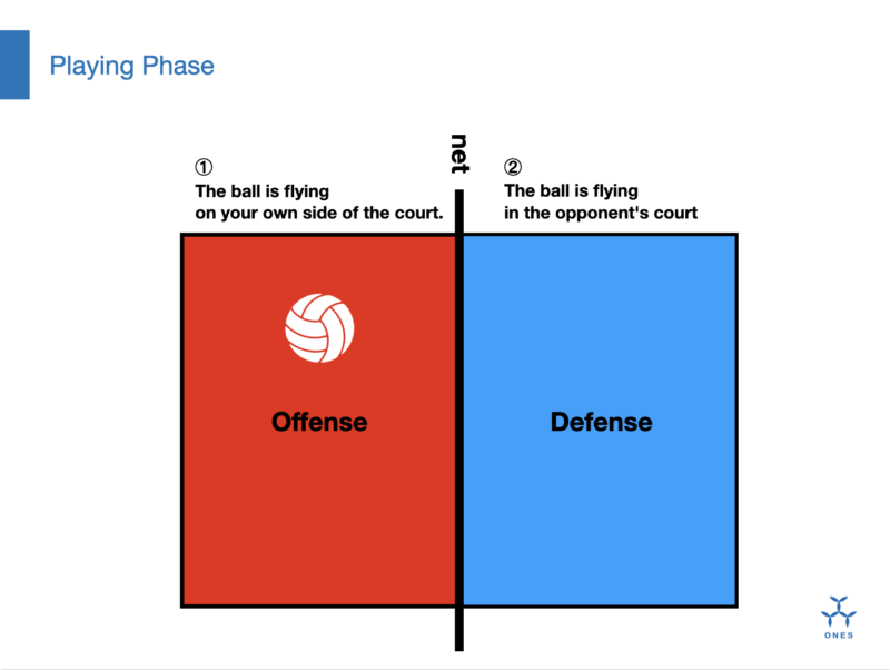 The team with the ball flying over its court is in the Offensive Phase. The opposite team is in the Defensive Phase. This is a simple, objective understanding accessible to anyone.
