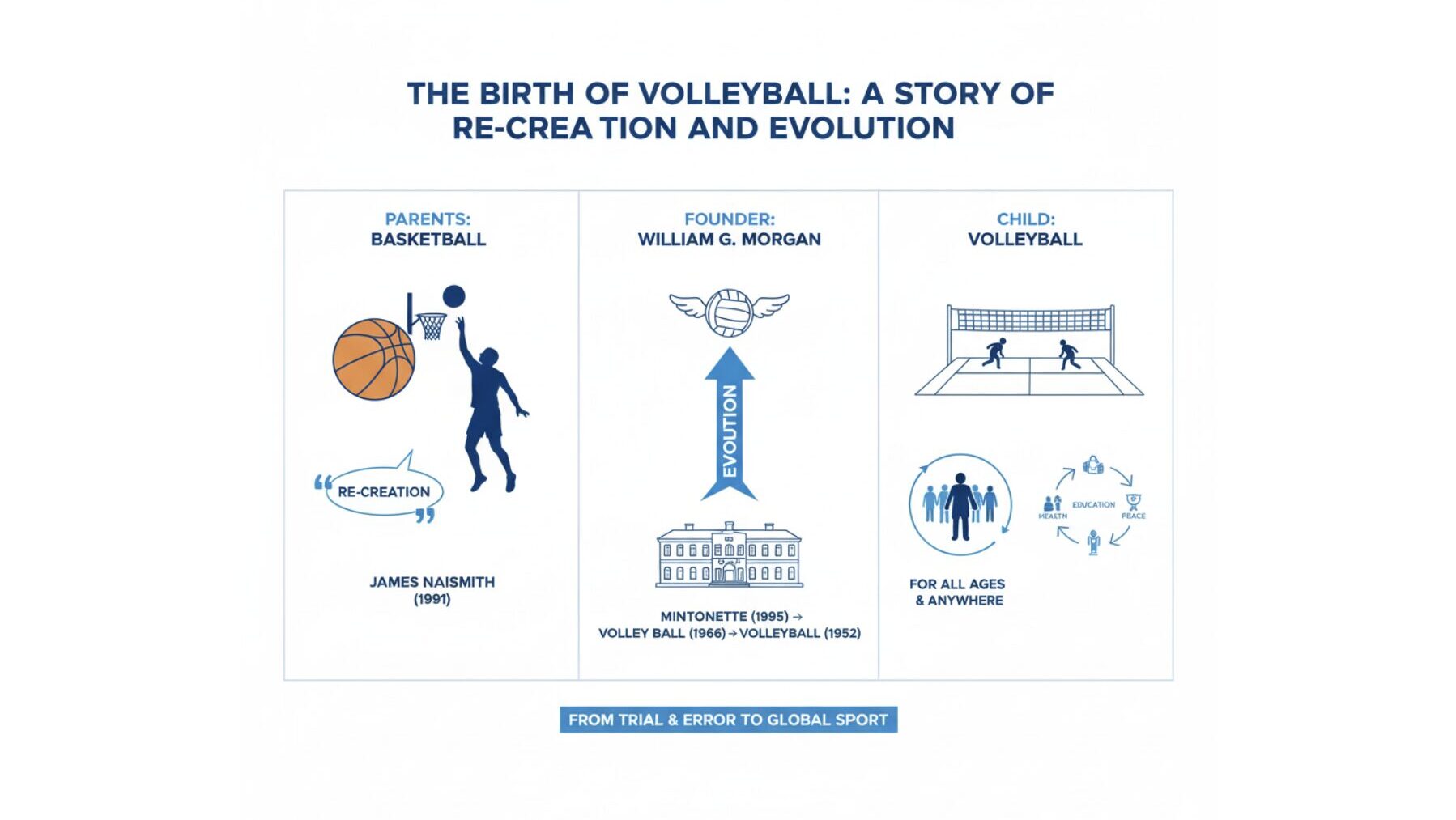 #VolleyballHistory #BirthOfVolleyball #JamesNaismith #WilliamGMorgan #YMCA #SportsEtymology #RecreationSport #Mintonette #VolleyBall #YouthVolleyball #VolleyballCoaching #CoachingTheory #SportsEvolution