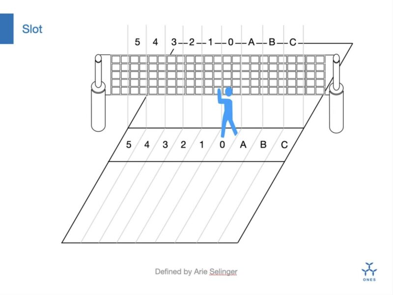The concept of ‘Slot’ is intuitively easier to grasp. In volleyball, the Slot refers to the spatial position from which an attacker hits the ball. More specifically, it often involves dividing the court width (9 meters) into segments using a horizontal coordinate axis parallel to the net, with numbers or symbols representing these spatial locations.